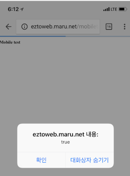 호스팅 서버에 올리고 모바일 기기에서 확인해보면 아래와 같이 true로 값이 경고창으로 나온다.